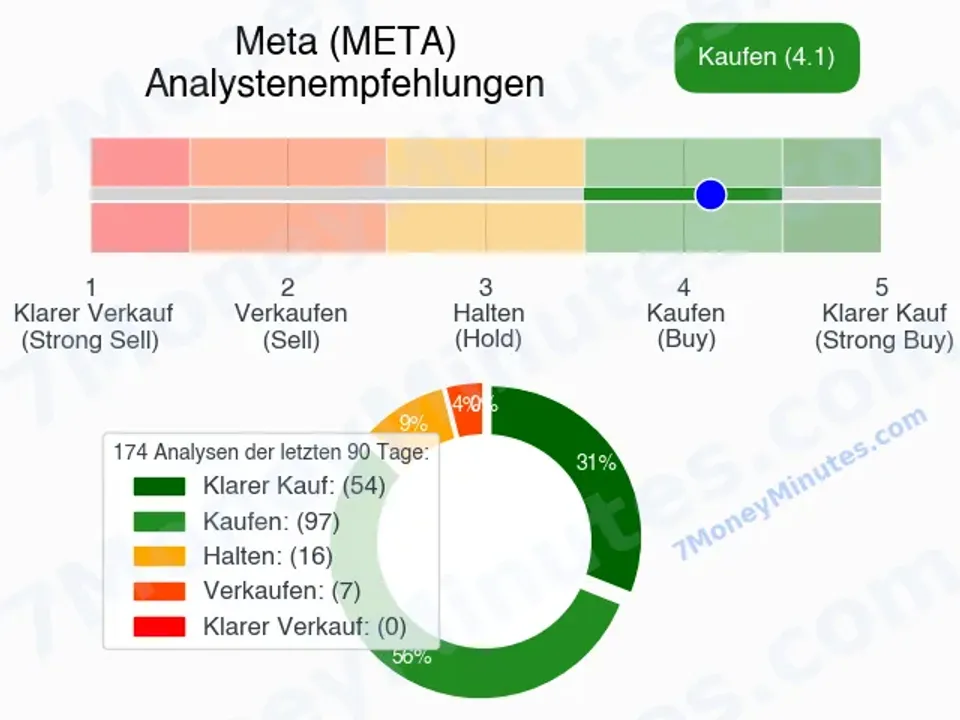 In den letzten 90 Tagen hat Meta mit 174 Analystenbewertungen und einer durchschnittlichen Bewertung von 4,1 von 5 Punkten signifikantes Interesse geweckt – ein sehr positives Signal der Analysten-Community.