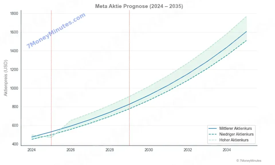 Die Prognosespanne für die Meta Aktie bis Ende 2034 spiegelt diese positive Stimmung wider und prognostiziert einen deutlichen Anstieg auf 1.351,25 $ bis 1.582,46 $, mit einem Mittelwert von ca. 1.436,72 $.